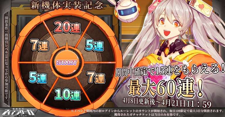 新機体実装を記念して、ルーレットを開催する予定です!イベント期間内初ログインからカウントが開始され、最大3日分です。