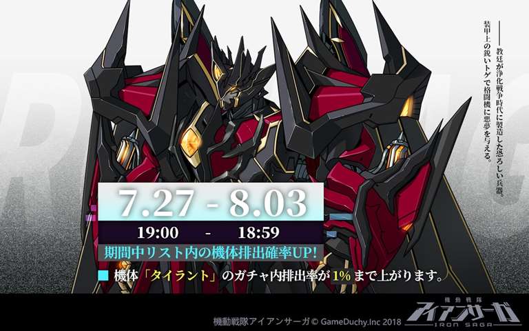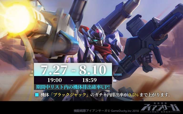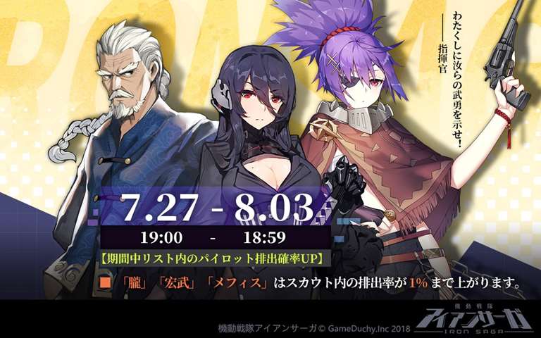 キャンペーン中、「朧」「宏武」「メフィス」のスカウト内排出率が上昇!さらに「タイラント」「ブラックジャック」の排出率アップ!