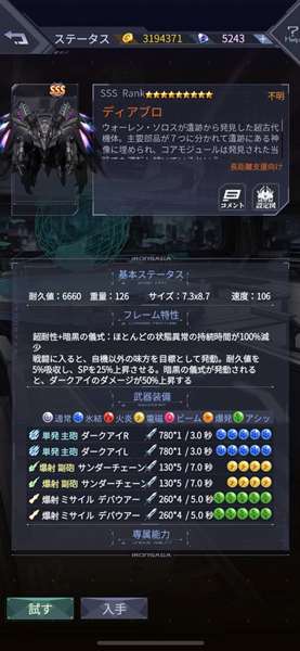 2020年3月6日金曜日のデータ更新につきまして、都合により、排出率UPキャンペン:機体ガチャ1を新機体:ディアブロに変更いたします。