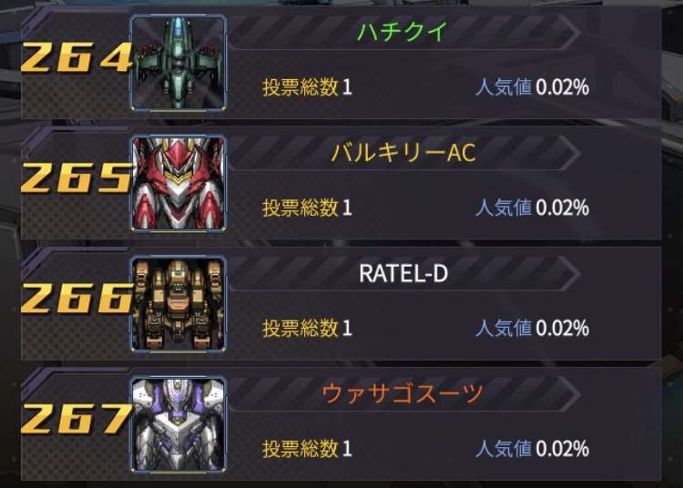 パイロットは162、機体は419あるんだから1票も入ってないやつよりかはマシだぞ